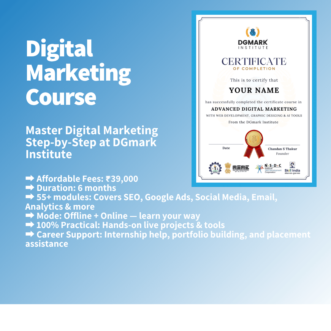 Looking to step into the world of digital marketing and unlock high-paying opportunities? At DGmark Institute, we empower students, working professionals, and business owners with the most in-demand digital skills – from SEO and Google Ads to Social Media Marketing, Content Strategy, and more.